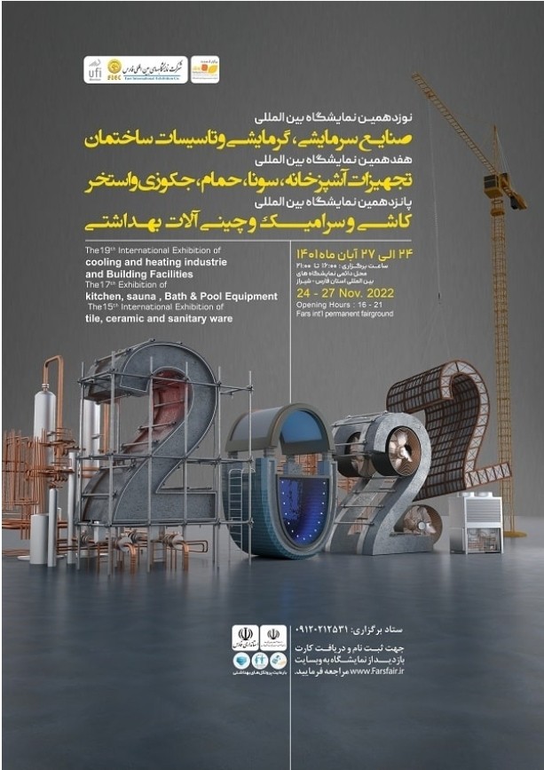 نوزدهمین نمایشگاه بین المللی صنایع سرمایشی، گرمایشی،و تاسیسات ساختمان، هفتمین نمایشگاه بین المللی تجهیزات آشپزخانه، سونا، حمام ، جکوزی و استخر، پانزدهمین نمایشگاه بین المللی کاشی و سرامیک و چینی آلات بهداشتی در 24 – 27 آبان ماه 1401 در نمایشگاه بین المللی شیراز برگزار شد.