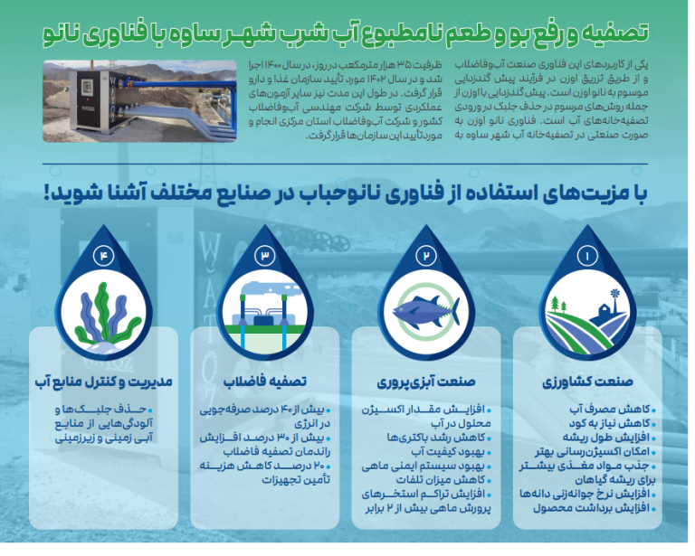 در اینجا ویژگیهای مختلفی از محصولات صنعتی فناوری نانو ساخت ایران در قالب تصویرسازیها و پوسترهای زیر نمایش داده شده است؛