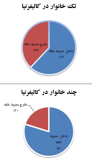 به طور کلی خانوارها در طول سال حجم زیادی آب را مصرف میکنند. میزان مصرف توسط تک خانوار در کالیفرنیا در بیرون خانه ( جهت آبیاری فضای سبز خانه و شست و شوی ماشین) شامل 38 درصد از کل آب مصرفی میباشد. از سوی دیگر چند خانوار ( مجموعه مسکونی که از چند خانه مجزا تشکیل شده است) مصرف کمتری خارج از خانه خواهند داشت که حدود 20 درصد را شامل میگردد (شکل 2). به نظر میرسد که با تصفیه آب خاکستری و استفاده مجدد از آن، میتوان نیاز آب مصرفی خارج از خانه را تامین نمود و تاثیر بسیار زیادی بر کاهش مصرف آب گذاشت.