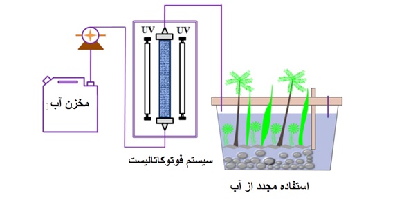 شکل 6: استفاده از نانو ذرات فوتوکاتالیستی در سیستم پرتودهی نور فرابنفش جهت کاهش آلودگی آب خاکستری [6].