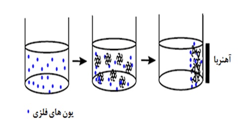 شمایی از عملکرد نانوذرات مغناطیسی اکسیدآهن و حذف یونهای فلزی از آب