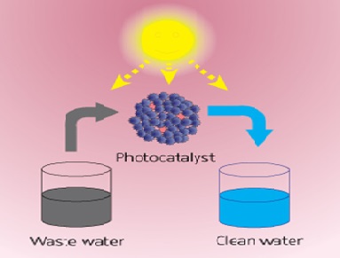 شمایی از انجام فرایند فوتوکاتالیستی بر روی آب آلوده و تبدیل آن به آب تمیز.