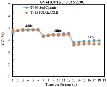 فلز فعال کاتالیستی در کاتالیست LTS تولید شده توسط گسترش فناوری خوارزمی، مس است که پس از احیای کاتالیست درون راکتور و تبدیل اکسید مس به مس، خاصیت کاتالیستی پیدا میکند. برای بیشینه کردن کارایی این کاتالیستها لازم است که آنها بیشترین سطح فعالیت کاتالیستی را داشته باشند. با ورود فناوری نانو به این صنعت و تولید نانوکاتالیستهای با سطح فعال قابل توجه، تحولی عظیم در کارایی آنها بهوجود آمده است. دستیابی به ریزساختار نانو حاوی ذرات با ابعاد کمتر از 20 نانومتر در این محصول سطح فعال بیشتر برای محصول و به دنبال آن اکتیویته بیشتری را به همراه داشته است. بهمنظور بررسی خاصت کاتالیستی این محصول، آزمون در سیستم کاتالیستی (Catatest) روی نمونه تولید شده و یک نمونه صنعتی (شرکت Sud-Chemie) انجام و گازهای خروجی با استفاده از دستگاه کروماتوگرافی اندازهگیری شد. مقایسه نتایج حاصل از آزمون کاتالیستی نمونه تولید شده و نمونه صنعتی، بیانگر انطباق بسیار مناسب این دو محصول است (شکل 2) [2].