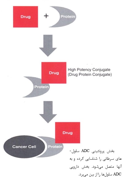 همان طور که قبلا نیز گفته شد، سایتوتوکسیکها اثرات نامطلوب شدیدی روی سلامتی بیمار دارند. اما با ترکیب اثرات کشنده سیتوتوکسیکها و خاصیت انتخابپذیری بالای پادتنها ، میتوان به یک راهکار درمانی مطلوب برای سرطان رسید. پادتنهای متصل شده (Conjugated) با دارو، یکی از این راهکارها است. در این راهکار پادتن، عوامل پادژنی (Antigene) موجود در سطح سلولسرطانی را شناسایی کرده و داروی کانجوگه شده به آن، با اثر سایتوتوکسیکی که دارد، سلول سرطانی را از بین میبرد. به این دسته از داروها، داروهای کانجوگه شده به پادتن (ADC) گفته میشود. در زیر نمایی از یک ADC نشان داده شده است.