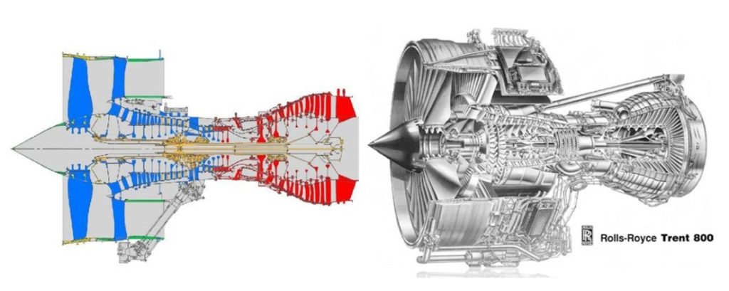 شکل 3- موتور جت شرکت Rolls-Royce، بخشهای قرمز، آبی و نارنجی به ترتیب از جنس فلزات نیکل، تیتانیوم و فولادهای نانوساختار ساخته شده است]2[.