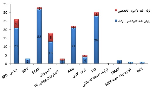 شکل 14– نمودار بررسی تعداد پایان نامههای ثبت شده کارشناسی ارشد و دکتری مربوط به تولید فلزات نانوساختار به روشهای مختلف SPD ثبت شده در پایگاه سایت ستاد نانو ]5[.