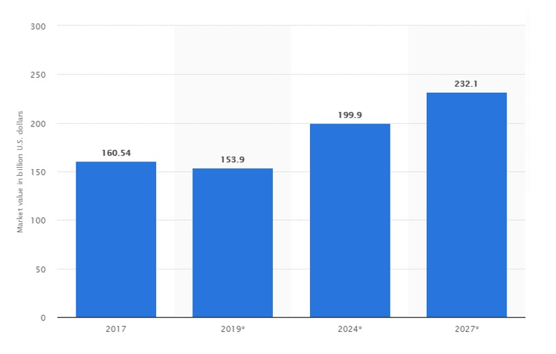 شکل ۱- ارزش بازار جهانی رنگ و پوشش و پیش‌بینی آن تا سال ۲۰۲۷ [۳].