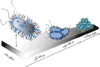 شکل ۲- مراحل رشد و باکتری روی سطح و تشکیل زیست‌لایه.
