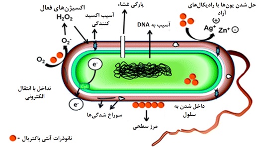 شکل ۳- شماتیکی از چگونگی فعالیت آنتی‌باکتریالی نانوذرات