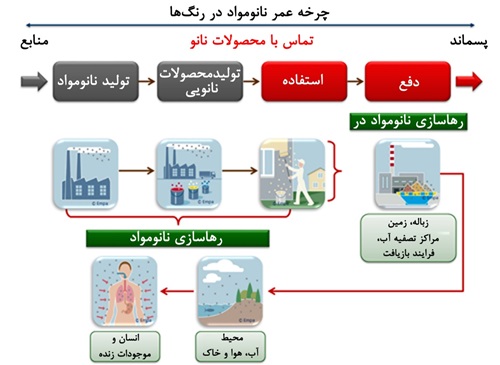 ۴- چگونگی رهایش ترکیبات نانومواد مورداستفاده در رنگ‌ها و چرخهٔ عمر آن‌ها