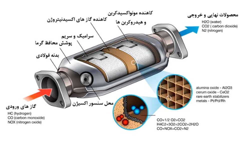 شکل ۲. تصویر شماتیکی از مبدل کاتالیست خودرو به همراه جزییات آن.