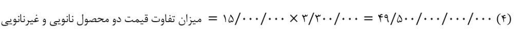همانطور که از جدول شماره 4 مشخص است، تفاوت قیمت دو محصول نانویی و غیرنانویی %۱۲.۲ است و به میزان ۰۰۰/۴۰۰ تومان کاتالیست نانویی ارزانتر است و همچنین میزان عمر مفید مبدل کاتالیست نانویی %۲۵ بیشتر از مبدل کاتالیست غیرنانویی است که اگر میزان پیمایش ۰۰۰/۲۴۰ کیلومتر از هر خودرو را بهعنوان مقدار مشترکی برای هر دو نوع کاتالیست نانویی و غیرنانویی لحاظ کنیم، کاتالیست غیرنانویی ۴ بار و کاتالیست نانویی ۳ بار بایستی تعویض شود که نشاندهنده 1 بار صرفهجویی در خرید کاتالیست است.
