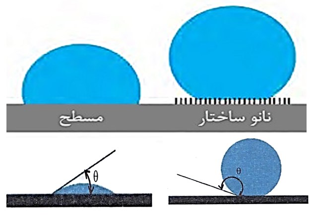 شکل 5: مقایسه نحوه تشکیل قطره و زاویه تماس آن در دو سطح مسطح و نانوساختار