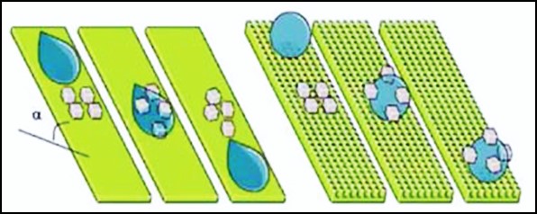 | مواد آبگریز به دلیل ناهمواریهای سطحی میکرومتری و نانومتری خود، اجازه پخش و یا جذب شدن آب به روی سطح را نمیدهند و از این رو باعث قطرهای شدن آب و سر خوردن آن میشوند. |
