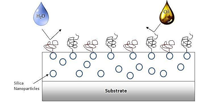 شکل 7: اتصال لیگاندهای آب گریز و روغن گریز با نانوذرات سیلیکا در سطح پوشش]6[.
