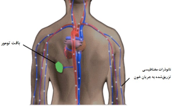 - پزشك نانوذرات مغناطيسي متصل به داروي ضدسرطان را از راه وريدي به بيمار تزريق ميكند و بدين ترتيب نانوذرات در جريان خون به گردش درميآيند.