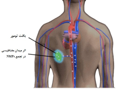 | قابلیت کنترل از راه دور | نانوذرات مغناطیسی به واسطۀ شیب میدان مغناطیسی خارجی که همراه با نفوذپذیری ذاتی میدان مغناطیسی در داخل بافتهای انسانی است قابل دستکاری و کنترل میباشند. | این عملکرد در انتقال و تجمع نانوذرات مغناطیسی، نشاندار کردن اختصاصی ساختارهای زیستی و به طور خاص در انتقال داروهای ضدسرطان به بافت توموری هدف استفاده میشود (شکل 2). |