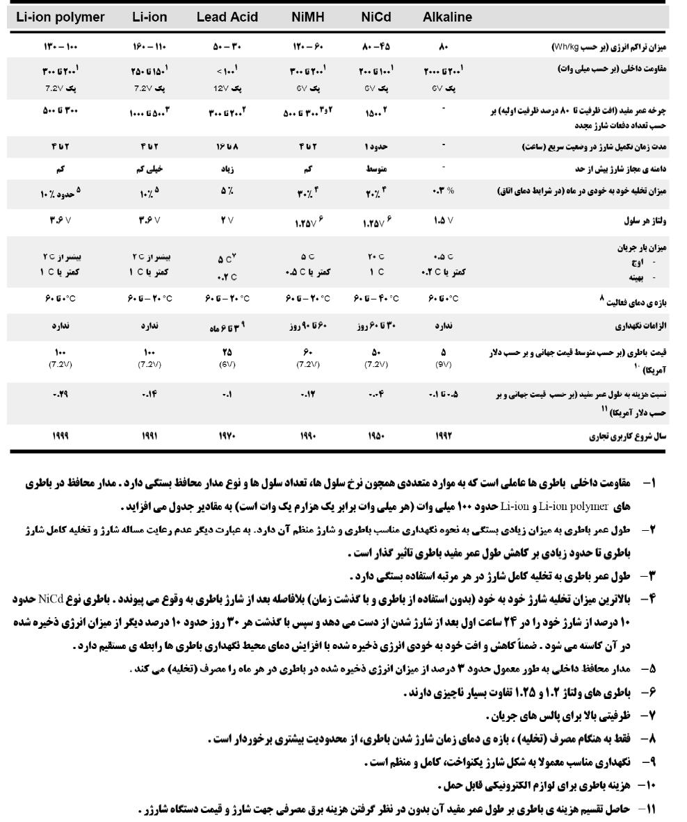 جدول 1- مقایسه خصوصیات فنی انواع باتری قابل شارژ]8[