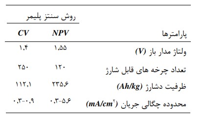 جدول 2- پارامترهای الکتروشیمیایی برای باتری قابل شارژ روی-پلی آنیلین ]11[