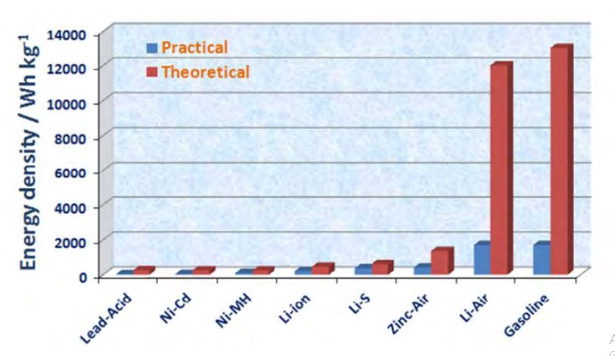 باتری‌های قابل شارژ باتری لیتیوم- هوا عملکرد خوب و آینده روشنی را برای دستگاه­های ذخیره انرژی قابل‌حمل نشان می ­دهد. شکل 7 مقدار انرژی تئوری و عملی برای باتری‌های قابل شارژ و سوخت‌های فسیلی و مقایسه بین آن‌ها را به‌خوبی می­دهد.
