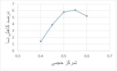 شکل ۱- تغییرات درصد کاهش دما برای تمرکز حجمی جزئیتر ذرات نانو Al2O3