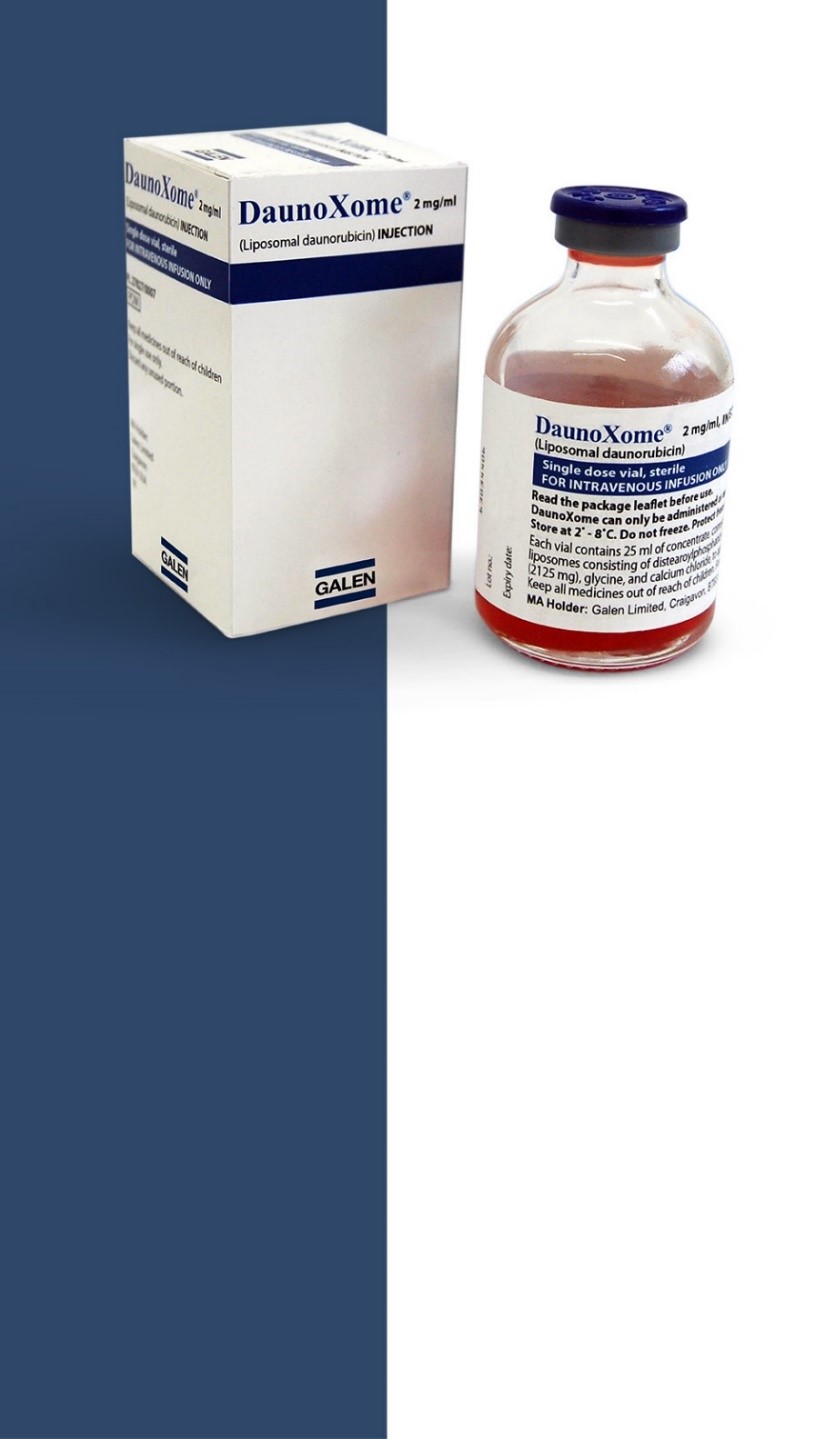دانوروبیسین لیپوزومی با نام تجاری DaunoXome©R (UK) یکی از داروهایی است که میتواند در درمان سرطانها استفاده شود. به دلیل اثربخشی و عوارض جانبی کمتر در مقایسه با داروهای سیتوتوکسیک مانند آدریامایسین، بلئومایسین و وین کریستین، تأیید خود را بهعنوان یک دارو سیتوتوکسیک پیشرفته دریافت کرده است. لیپوزومها قطر تقریبی 45 نانومتر دارند و از دولایه لیپیدی تشکیل شدهاند که از کلسترول و دی استئاروئیل فسفاتیدیل کولین و با نسبت مولی 1:2 تشکیل شده است [16].
