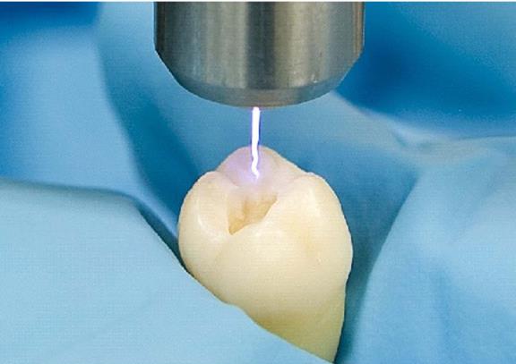 از نتایج امیدبخش اخیر، میتوان به کاربرد برس پلاسما (شکل 2) برای از بین بردن باکتریهای درون کانالهای ریشه دندان اشاره کرد. برس پلاسما قادر است تا در کمتر از 30 ثانیه با انجام واکنشهای شیمیایی، حفرههای دندان را تمیز و ضدعفونی کرده و جهت پر شدن آماده سازد. علاوه بر خواص باکتریکشی، شعله سرد برس پلاسما پیوند بهتری بین مواد پرکننده و دندان بوجود میآورد. واکنشهای شیمیایی حاصل از برس پلاسما، عملا سطح دندان را تغییر داده و سبب پیوندی قوی و محکم با مواد پرکننده میگردد.