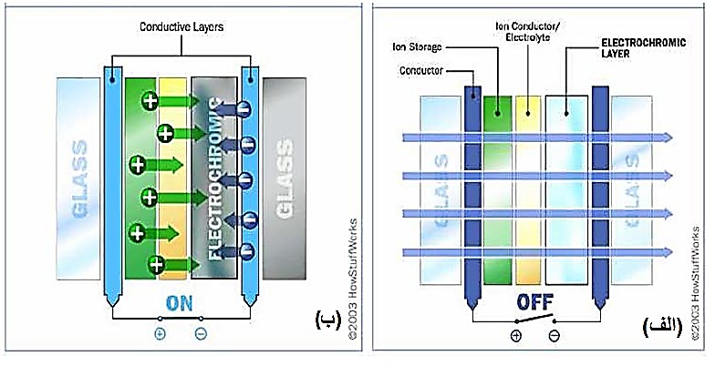 شکل 4: قابلیت تنظیم رنگ شیشه در اثر اعمال جریان]4[.
