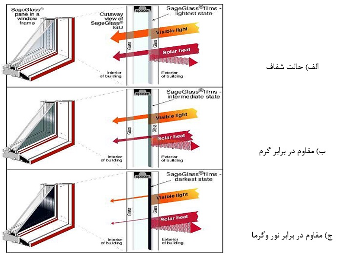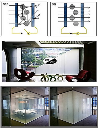 شکل 3: عملکرد شیشههای الکتروکرومیک کریستال مایع و کاربرد آن ها در فضای داخلی و بیرونی ساختمان]2[.