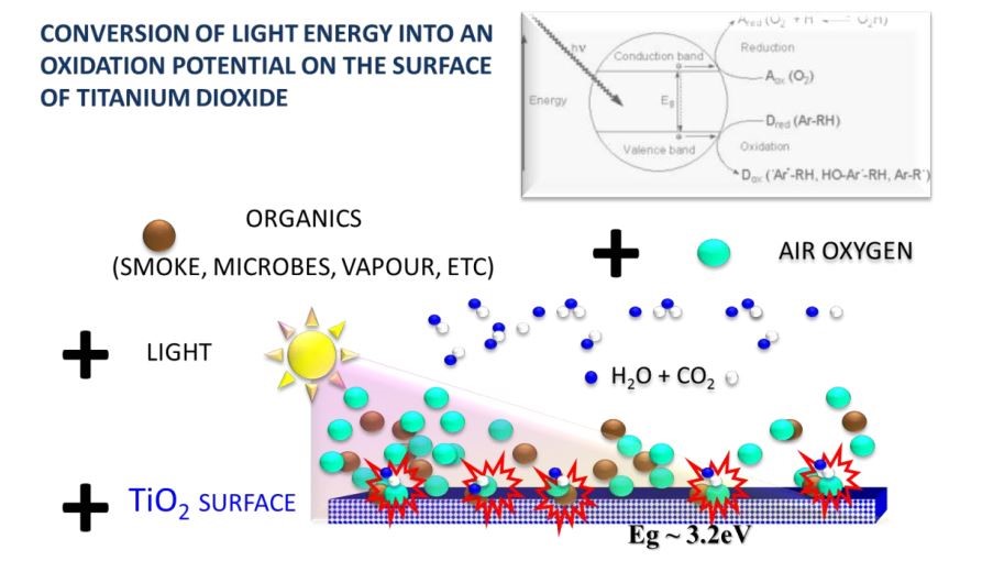 فوتوکاتالیستها واکنشهای شیمیایی را در زبر تابش نور سرعت میبخشند. این در مورد تجزیه مواد ارگانیکی مانند چربیها، روغن یا حتی میکروبها نیز صدق میکند. در مورد معمولترین فوتوکاتالیست مورد استفاده TiO2، عملکرد کاتالیستی به شکل قابل توجهی در مقیاس نانو بهبود مییابد.