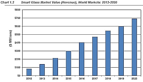 پیش بینی و روند بازار شیشه های هوشمند برای سال های 2014 تا 2020 در نمودار زیر نشان داده شده است. این نمودار مربوط به بازار شیشههای هوشمند، شامل شیشههای الکتروکرومیک، کریستال مایع، فتوکرومیک و … در کاربردهای نظیر معماری، حمل و نقل، سلولهای خورشیدی و الکترونیک است. ارزش بازار برای این پوششها در سال 2013 نزدیک به 4/1581 میلیون دلار بوده است و انتظار میرود به ارزشی بالغ بر 5814 میلیون دلار تا سال 2020 برسد.