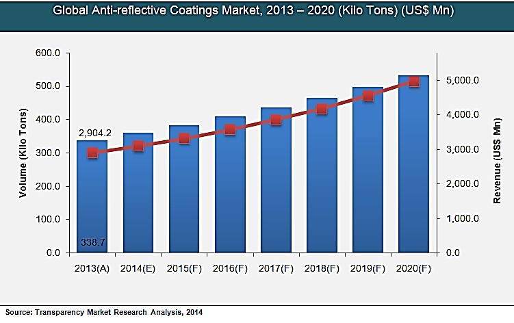 همچنین پیش بینی بازار پوششهای ضد انعکاس با کاربرد در انرژی خورشیدی، خودرو و ساختمانها و دارا بودن بیشترین سهم در اپتیک و الکترونیک برای سال های 2014 تا 2020 در شکل 7 نشان داده شده است. در سال 2013 ارزش بازار پوششهای ضد انعکاس با تقاضایی حدود 7/338 کیلوتن حدود 90/2 میلیارد دلار بوده است که انتظار میرود این مقدار با رشد 2/8% خود به حدود 97/4 میلیارد دلار تا سال 2020 برسد.