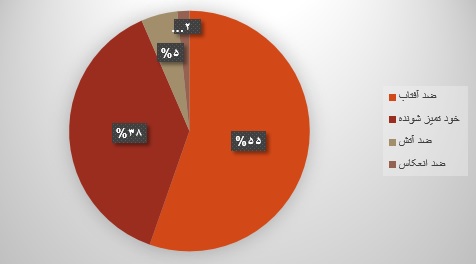 بهمنظور تعیین سیر تحقیقات و اختراعات ارائه شده در زمینهی کاربرد فناوری نانو در شیشههای هوشمند، پتنتهای ارائه شده در این زمینه بررسی شدند که در این میان تعداد 891 پتنت مربوط به کاربرد فناوری نانو در زمینه شیشههای هوشمند، وجود دارد که این تعداد بالا نشاندهندهی توجه متخصصان در زمینهی تجاریسازی و اهمیت رقابتی این محصولات است. همچنین تعداد پتنتهای مربوط به شیشههای هوشمند (ضد آفتاب، ضد انعکاس، ضد آتش و خودتمیزشونده) بهطور جداگانه مشخص گردید. با توجه به تعداد کل پتنتهای ثبت شده، بیشترین سهم پتنت بهترتیب مربوط به شیشههای الکتروکرومیک و خودتمیزشونده است. درصد وضعیت اختراعات ثبت شده مربوط به شیشههای هوشمند در شکل 8 نشان داده شده است.