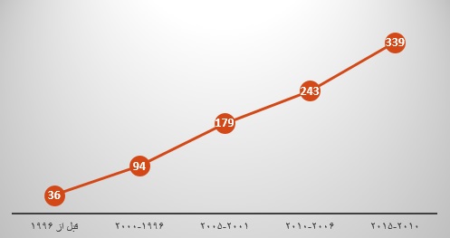 همچنین روند زمانی تعداد اختراعات ثبت شده از سال 1996 تا به امروز مربوط به شیشههای هوشمند در شکل 9 نشان داده شده است. با توجه به شکل مشاهده میشود که روند ثبت اختراعات تا سال 2015 سیر صعودی داشته و از سال 2006 به بعد اختراعات زیادی در این زمینه ثبت شده است.