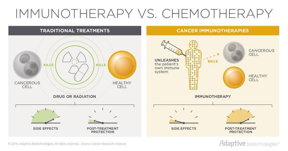شکل 1 قصد دارد تفاوتهای شیمیدرمانی و ایمنیدرمانی را نشان دهد. در رویکرد شیمیدرمانی، از داروها و مواد شیمیایی استفاده میشود که قابلیت از بین بردن سلولهای سرطانی را دارند. این داروها ممکن است که بعضی سلولهای سالم خود بدن (مانند فولیکول مو) را نیز تحت تأثیر قرار دهند. همچنین پس از اتمام دوره درمان، همچنان شانس بازگشت سرطان وجود دارد؛ اما درباره ایمنیدرمانی، همه موارد گفته شده برعکس است. از آنجایی که در این رویکرد خود سیستم ایمنی بدن انسان سلولهای سرطانی را شناسایی کرده و آنها را از بین میبرد، شانس بازگشت سرطان بعد از درمان خیلی کاهش پیدا خواهد کرد. همچنین احتمال آنکه سیستم ایمنی سلولهای سالم را نیز تحت تأثیر قرار دهد، ضعیف است. [2]