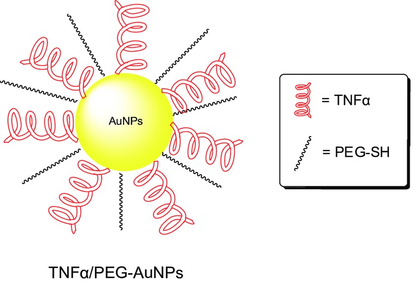 شکل 5- شماتیکی از سامانه Aurimune که در آن هسته از جنس طلا و فاکتور رشد و پلیمر PEG قابل مشاهده هستند. به نوعی یک ساختار هسته-پوسته دارد.