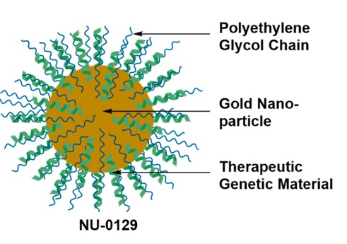 NU-0129 نانوذرات کروی طلا هستند که با استفاده از نوکلئیکاسید پوشش داده شدهاند.[10]