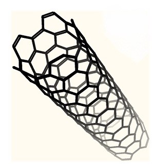 شکل 1: ساختار یک نانو لوله کربنی، قطر لوله تنها چند نانومتر (میلیاردیوم متر) است و دیواره از اتم های کربن تشکیل شده است که در ساختاری شش وجهی (لانه زنبوری) در کنار هم قرار گرفته اند.