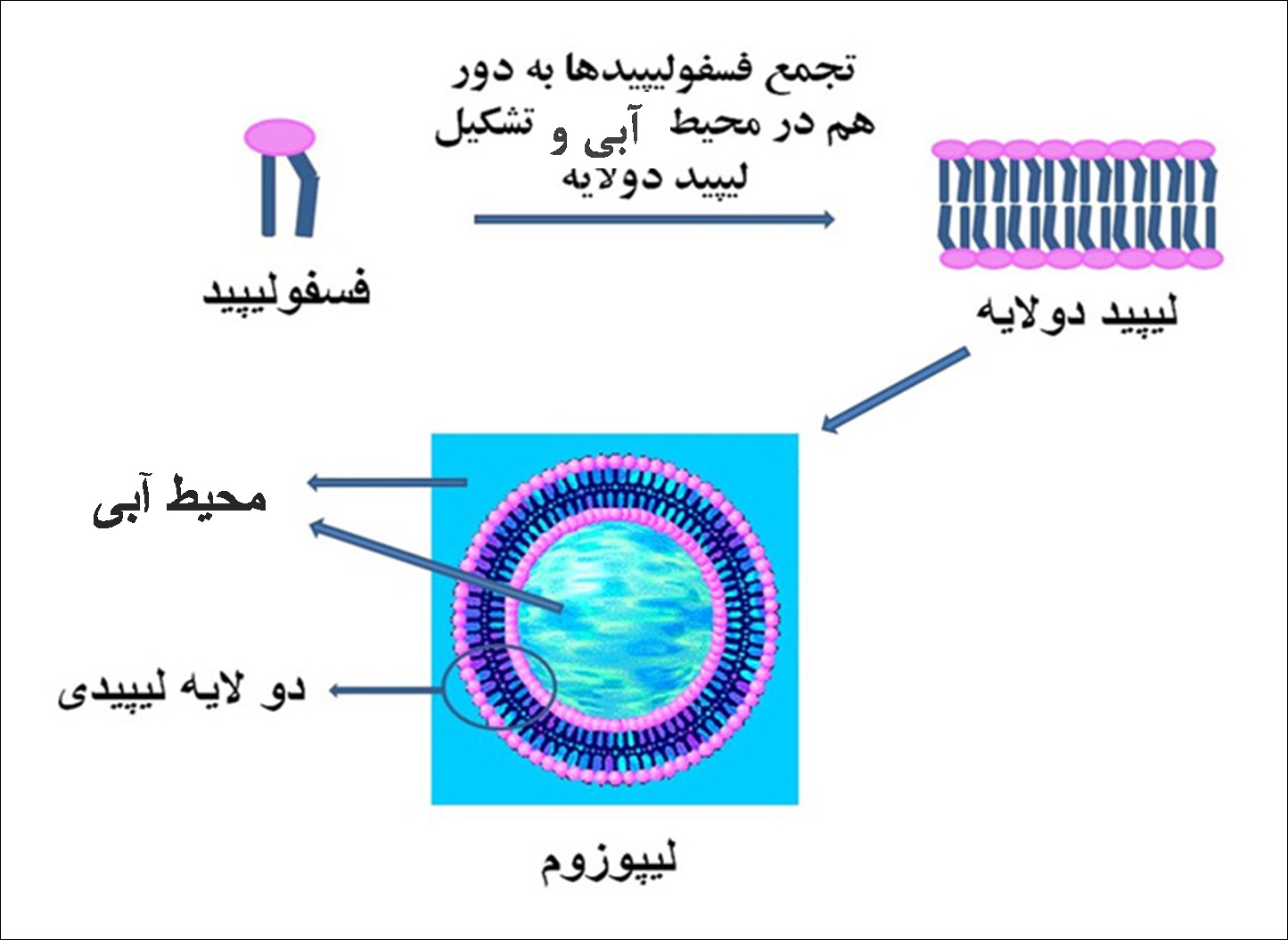 لیپوزومها از اجتماع این فسفولیپیدها در محیط آبی به دور هم به وجود می آیند. شکل2 نمایی از لیپوزوم را نشان میدهد.
