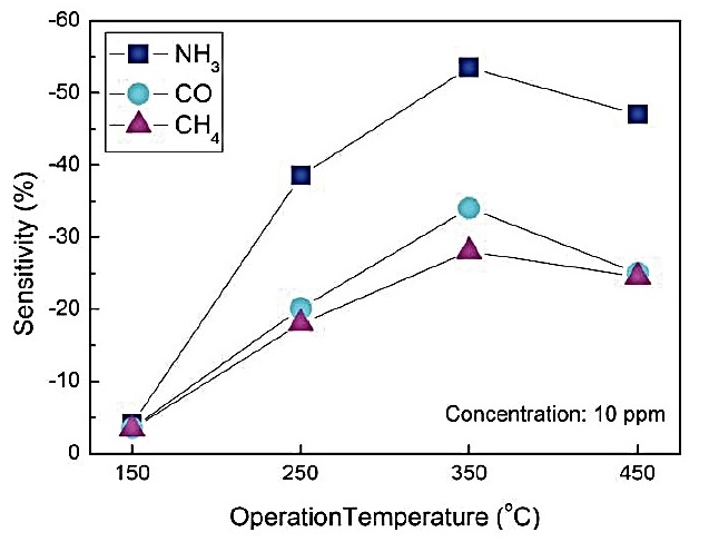 نانومیلههای ZnOمیزان حساسیت متفاوتی را نسبت به گازهای مختلف از خود نشان میدهند. در شکل زیر این تفاوت برای گازهای آمونیاک، مونوکسیدکربن و متان با غلظتهای یکسان 10 ppm)[3] ) نشان داده شده است.