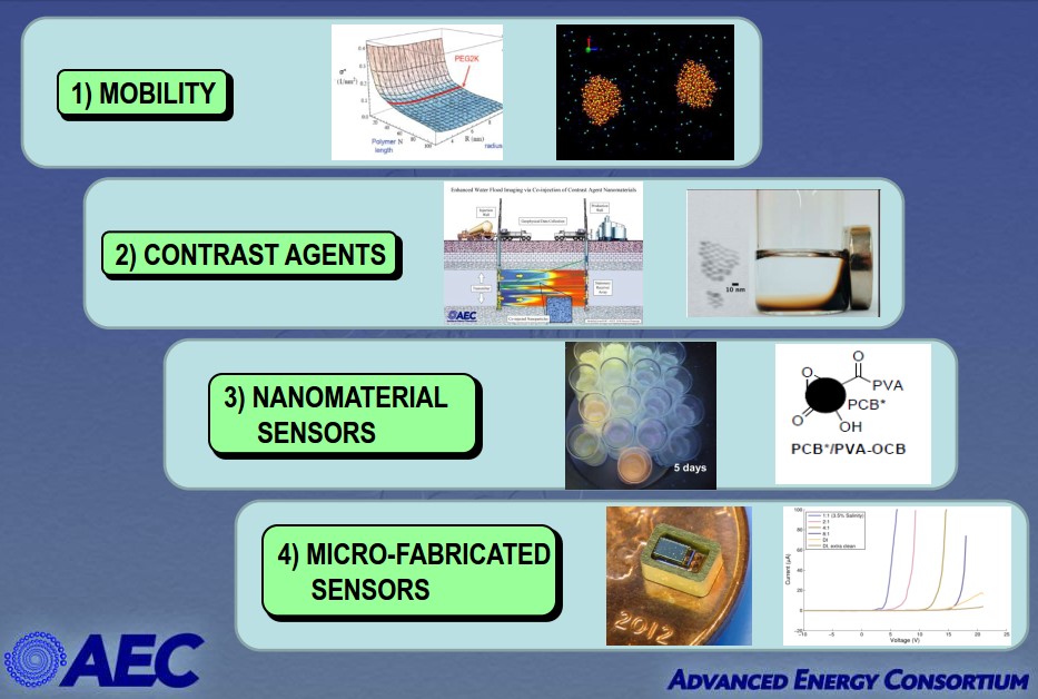 بزرگترین پروژه پژوهشی میان صنایع نفتی و دانشگاههای جهان تحت عنوان کنسرسیوم انرژی پیشرفته[1] (AEC) هدف توسعه استفاده از نانو ادوات آنالیزی درون مخازن نفتی در سال 2008 تشکیل شد. این کنسرسیوم توسط دفتر زمین شناسی اقتصادی[2] آمریکا شروع شد و هدف آن استفاده از دانش کاربردی فناوری نانو و اختصاصاً نانو و میکرو حسگرها در صنایع بالادستی نفت بوده است. ماموریت نهایی این کنسرسیوم ایجاد تغییر اساسی و مثبت در افزایش برداشت نفت از مخازن است به طوریکه این فناوری چهره این صنعت را با تغییرات کلی روبرو کند. در این کنسرسیوم بیش از 26 دانشگاه و موسسه تحقیقاتی برتر و بیش از 10 شرکت بزرگ نفتی جهان حضور دارند.
