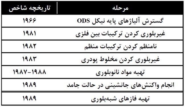 جدول 1- نقاط عطف در پیشرفت و گسترش آلیاژسازی مکانیکی ]1[.