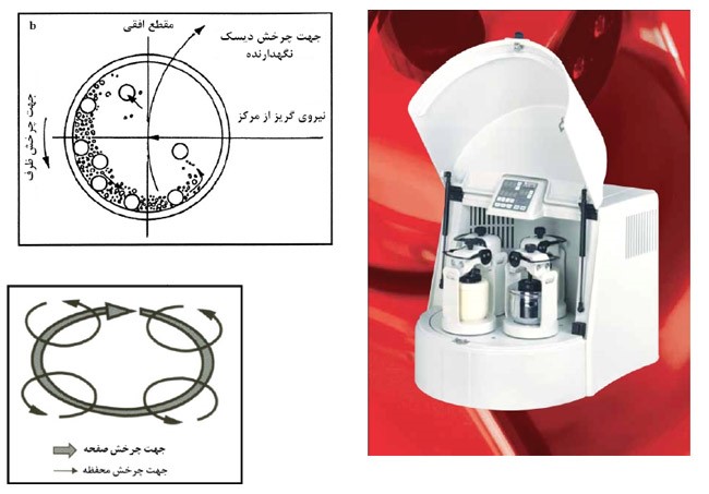 شکل 2– آسیاب ساینده به همراه بخشهای مختلف آن؛ a– شماتیک، b– نمونه واقعی ]1[.