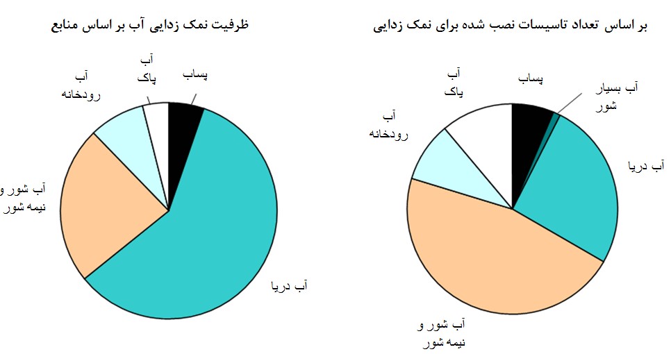 شکل 1 : تصویر سمت چپ ، ظرفیت منابع آب جهت نمک زدایی و شیرین سازی را نشان میدهد و تصویر سمت راست، نشان دهنده آن است که بیشتر تاسیسات نمک زدایی موجود، بر روی آب های شور و نیمه شور مورد استفاده قرار میگیرد.