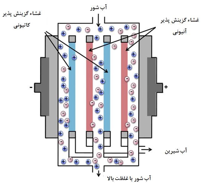 سیستمهای یون زدایی خازنی و الکترودیالیز، هر دو از یک اساس کلی پیروی میکنند که مبنای آن کاهش مقدار شوری آب از طریق ایجاد میدان الکتریکی و مهاجرت الکتریکی یونها میباشد. اما این دو سیستم از لحاظ ساختاری و چگونگی کاهش شوری متفاوت هستند. در سیستمهای الکترودیالیز، آب ورودی به میان غشاهایی وارد میشود که این غشاها به دو نوع غشاء گزینشپذیر آنیونی و غشاء گزینشپذیر کاتیونی تقسیم میشوند که به صورت یک در میان قرار گرفتهاند. اعمال میدان الکتریکی منجربه مهاجرت آنیونها و کاتیونها به سمت قطب مخالف شده و به واسطه غشاهای گزینش پذیر، میان غشاها دو نوع کانال مجزا به صورت یک در میان شکل میگیرد. یکی از کانال ها مربوط به آب نمکزدایی شده میباشد و در دیگر کانال، آب غلیظ و شورتری تشکیل میشود (شکل 3) . بزرگترین مشکلی که سیستمهای الکترودیالیز دارد استفاده از غشاءهای گزینش پذیر آنیونی و کاتیونی است که هزینه نگه داری و یا تعویض آنها گران است .