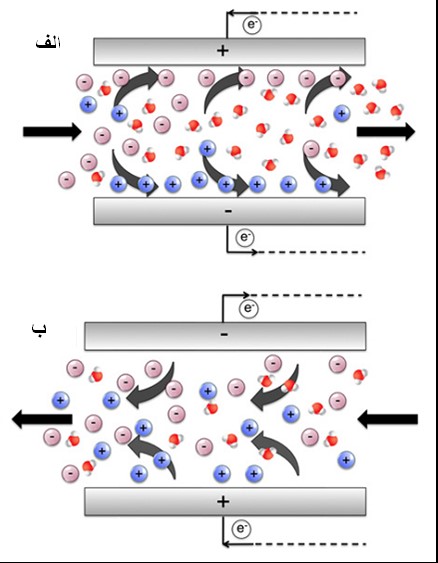 شکل 4 : سیستم یون زدای خازنی الف) جذب یونها و تولید آب شیرین ب ) باززایی یون زدای خازنی و دفع یونهای جذب شده با تغییر جریان الکتریکی [2].