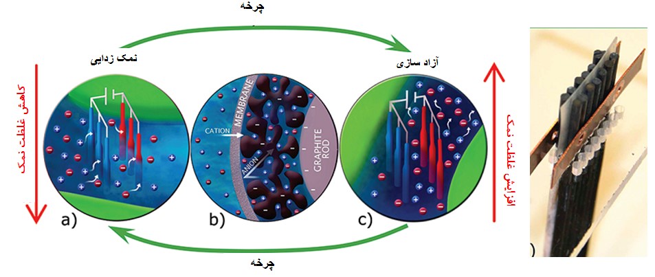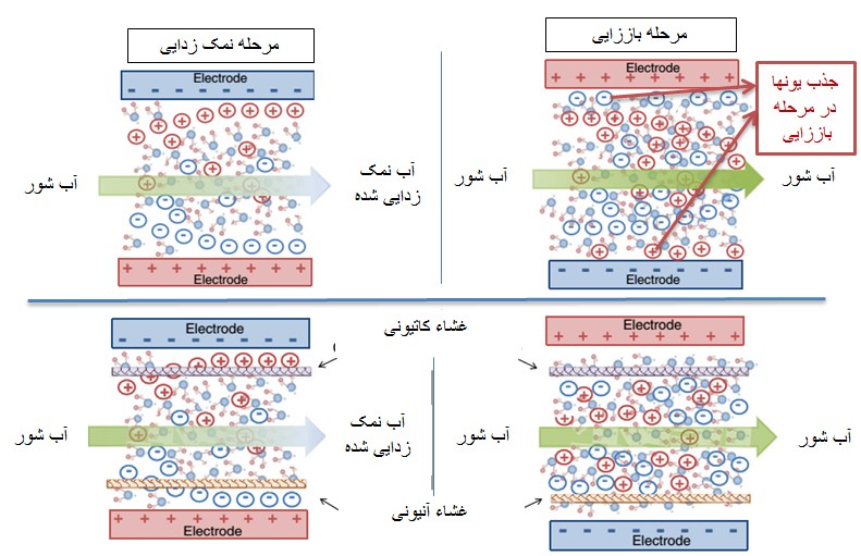 در سیستمهای یون زادی خازنی ، آب شور از درون کانالی عبور میکند که دارای الکترودهایی با سطح تماس زیاد است. با اعمال ولتاژ، یونها تحت میدان الکتریکی در سطح الکترود جذب میشوند ( شکل 4 ). در نتیجه این عمل، میزان شوری آب کاهش یافته و آب شیرین از سمت دیگر سیستم خارج میگردد. برای باززایی مجدد الکترودها، با تغییر ولتاژ اعمالی، یونهای جذب شده از سطح الکترود خارج شده و به جریان آب عبوری وارد میشوند ( شکل 4 ). این چرخه میتواند در سیستمهای یون زدای خازنی بارها تکرار شود.