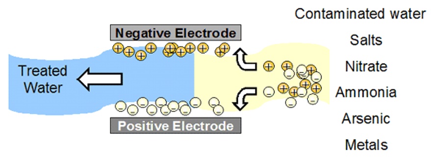 سیستمهای یون زدای خازنی[1] جهت تصفیه آب در دهه 1960 میلادی مورد توجه واقع شد. کلیات عملکرد این سیستم ها بر مبنای جذب کاتیونها و آنیونها بر روی سطح الکترود میباشد. به دلیل اشباع شدگی سریع و همچنین ظرفیت کم سیستمهای یون زدایی، این فناوری تا یک دهه پیش توسعه سریعی نداشته است. یون زداهای خازنی بیشتر جهت نمک زدایی آبهای شور و نیمه شور مورد توجه میباشد. با این حال در جهت رفع آلایندههای یونی مانند فلزات سنگین ، نیترات ، آمونیم و … نیز استفاده میشود (شکل 2 ). این سیستم ها به ولتاژهای بالا نیاز ندارند و مصرف انرژی در آنها کم میباشد .