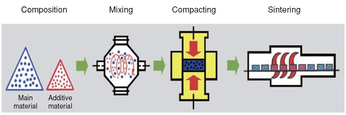 شکل 1- مراحل اصلی انجام فرآیند متالورژی پودر جهت ساختن قطعه مورد نظر ][1][.