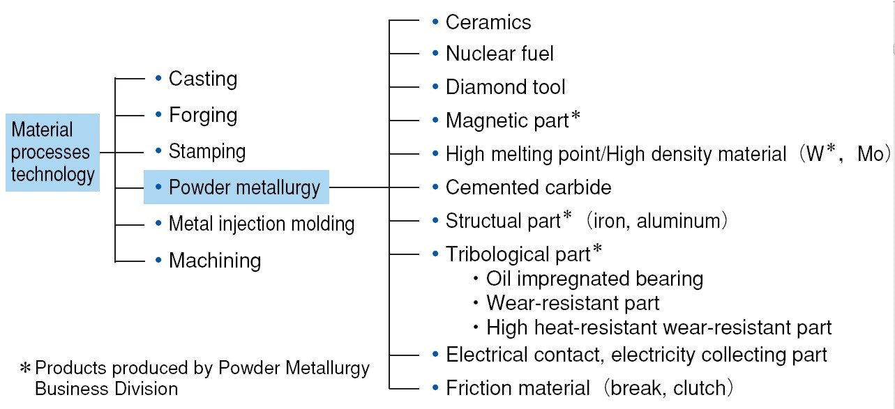 یک شرکت ژاپنی به نام Hitachi chemical ]1[ فعالیتهای گستردهای در کاربرد فناوری نانو در متالورژی پودر انجام داده است. محصولات مختلف این شرکت عبارتند از مواد الکترونیکی، قطعات خودرو، سیستمهای ذخیره انرژی، پودرهای مواد معدنی و موارد دیگر. آنها با بهرهگیری از تکنولوژیهای نوین در تولید پودرهای نانو و همینطور استفاده از کوره های خلأ قادر به تولید مواد جدید با فناوری نانو هستند.